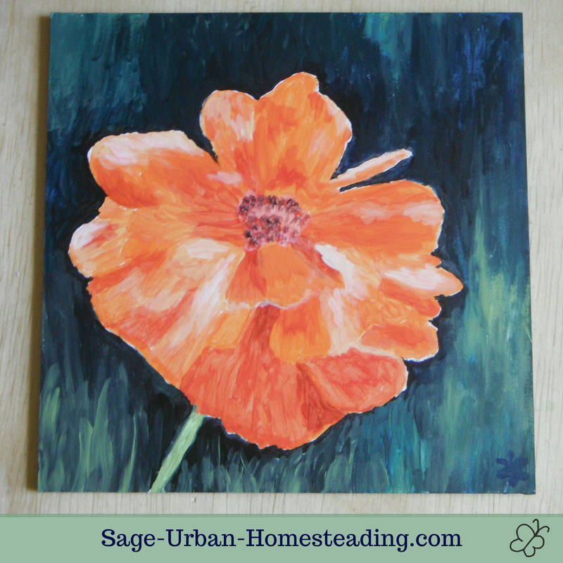 The book used a red poppy, but we grow the orange kind. I had taken a photo in our garden in May, knowing that this painting was coming up.